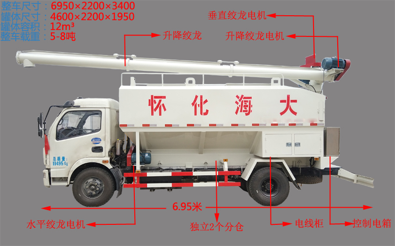 (4)料罐容積:12-14方或者17方,2個(gè)獨(dú)立倉,實(shí)載:豬料9噸,雞料10噸