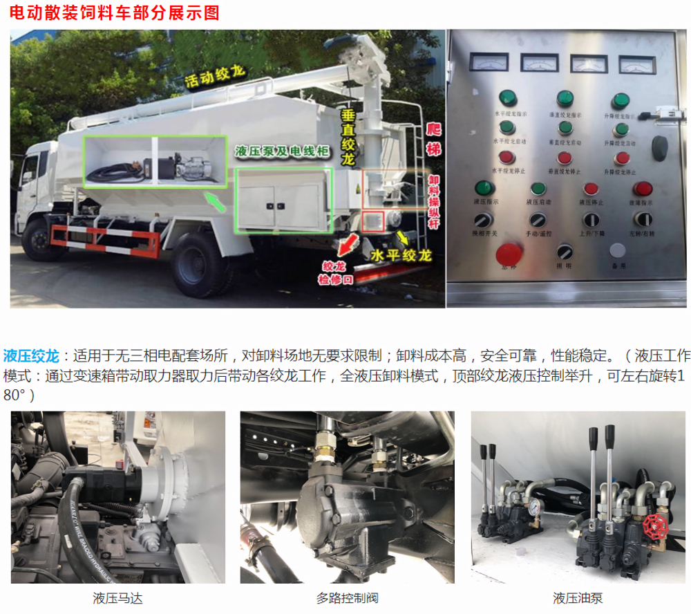 用進口液壓配件。使用電動絞龍需外接380V電源,或加裝車載發(fā)電機。電動系統(tǒng)采用西門子電機,液壓馬達液壓