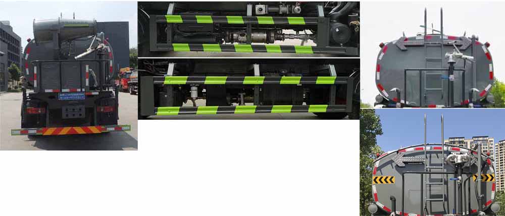 罐體總容量:9.77立方米,罐體有效容積:9.3立方米;罐體外形尺寸(×長軸×短軸)(mm):4200×2300×1450,4000×2300×1540;ABS型號/生產廠家:3631010-C2000/東科克諾爾商用車制動系統(tǒng)(十堰)有限公司,ABS 8/東科克諾爾商用車制動系統(tǒng)(十堰)有限公司,4460046450/威伯科汽車控制系統(tǒng)(中國)有限公司,J ABS/焦作博瑞克控制技術有限公司.隨底盤選裝駕駛室,選裝底盤附件位置,選裝噴霧裝置樣式;所用材料材質、連接方式以及后部防護裝置的主要尺寸參數(shù)(斷面尺寸和離地高度):側、后防護材料均為:Q235碳鋼,連接方式均為:螺栓連接,后部防護截面尺寸(mm):120×50,后部防護離地高度(mm):450;專用功能及裝置:該車主要用于城鄉(xiāng)園林綠化噴灑;主要裝置為水罐及噴灑裝置;選裝油箱和消聲器的安裝位置.選裝儲氣筒位置.選裝后部箭頭燈。
