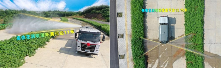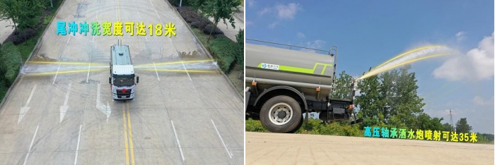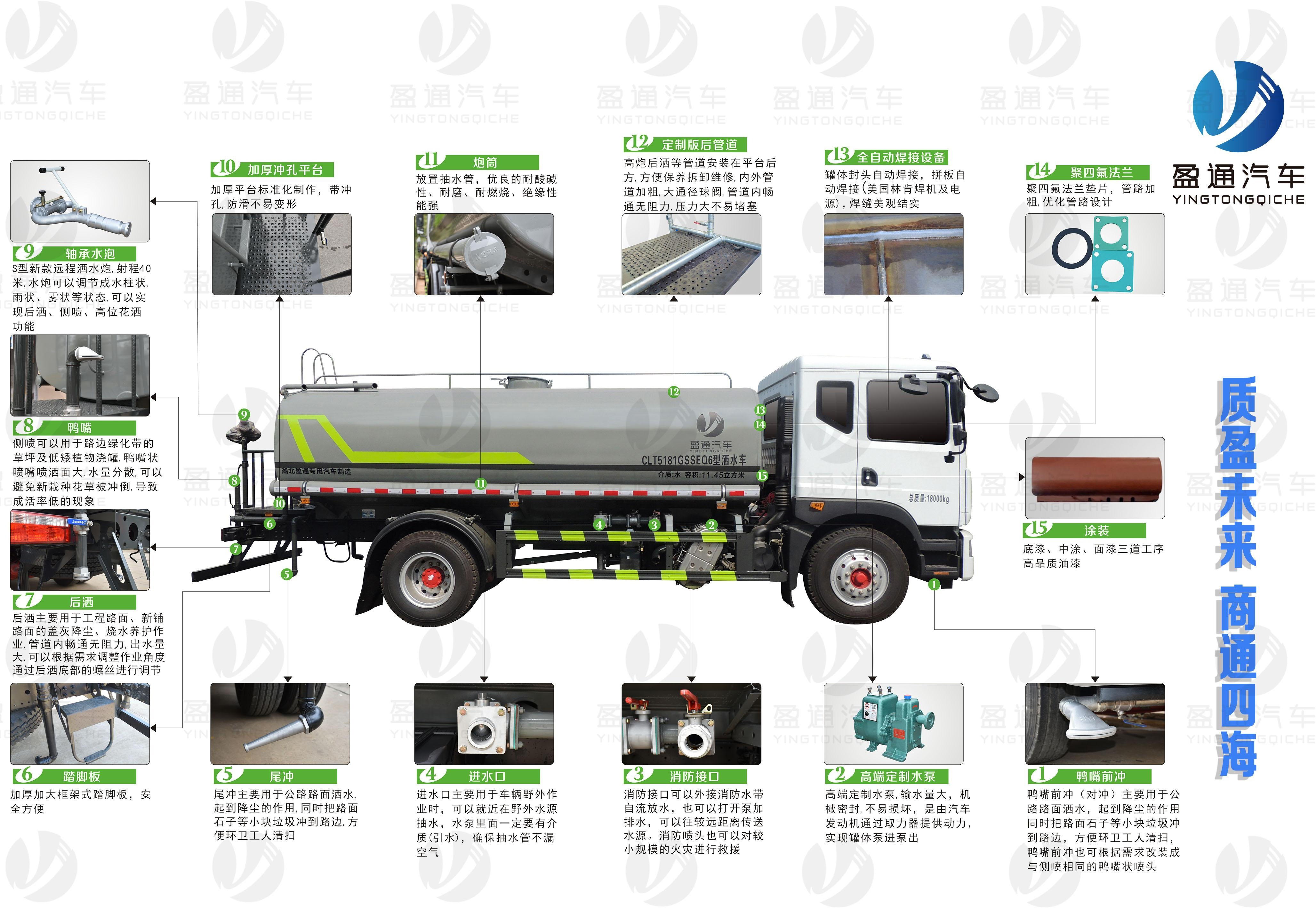 我公司產品標配前噴(鴨嘴)、后沖、后灑、側噴、后置式工作平臺,平臺上配置綠化水炮( 360°旋轉,既可以調成柱狀,也可以調成霧狀,更可以調成直沖狀、大雨、中雨、小雨、毛毛雨),配備優質大功率專用灑水泵可自吸自排,可從河里或池塘抽水到罐體取力器,雜物過濾網,消防接口,自流球閥系統、取力器、球閥、濾網均為國家標準產品,主管道加粗,法蘭墊、法蘭盤加厚,大通徑球閥。整體具備性能優良安全可靠、效率高、流量大、維修方便等特點。
