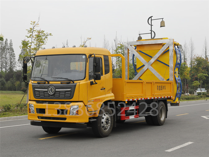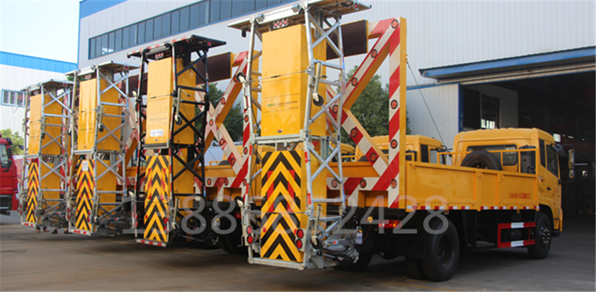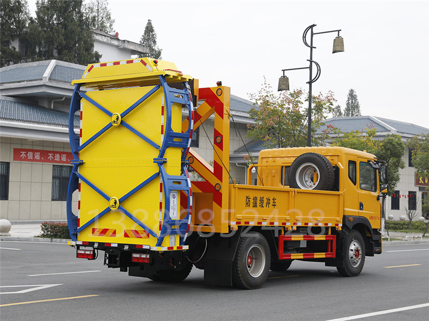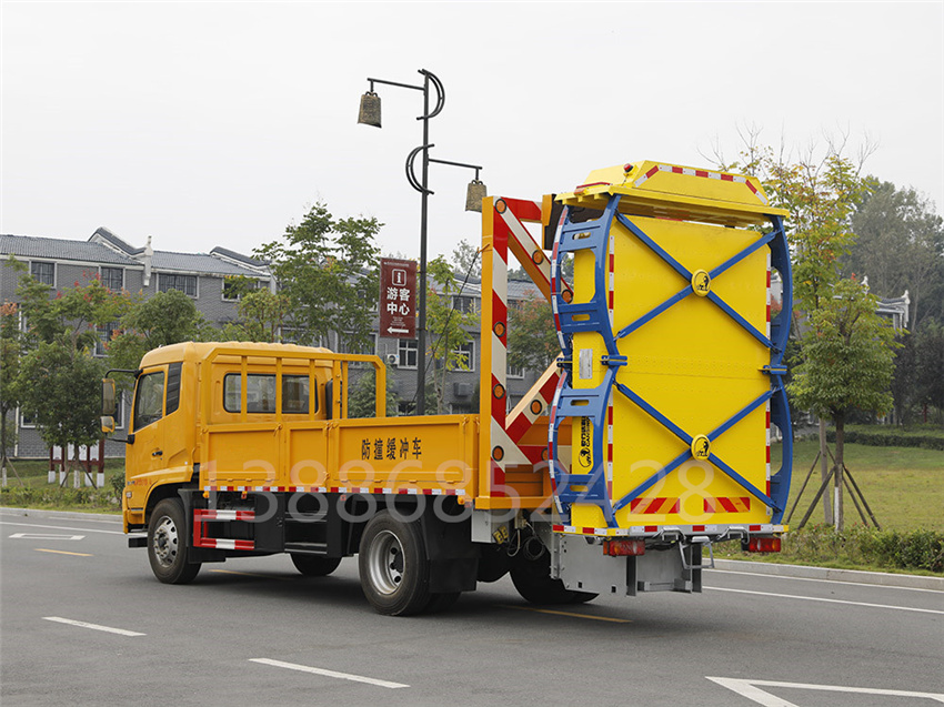 防撞緩沖車采用國六東風天錦底盤。防撞緩沖模塊升降采用液壓控制,過程平穩、安全、機械化作業程度高,操作方便。防撞緩沖模塊整體采用國產乾行達公司技術產品100E防撞緩沖模塊,太平洋保險承保。適用于城市道路,郊區道路,高速公路,機場橋涵等場合。主要功用:置于道路施工作業人員和設 備后方,在發生追尾事故中充當肇事車輛和施工作業人員或設備的緩沖區域,并且通過自身結構變形吸收撞 擊能量,最大限度的降低施工人員或設備發生危險的幾率,同時最大限度的降低肇事車輛及人員的危險。