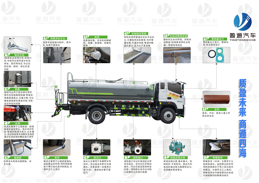 天錦22方灑水車_東風天錦22方水罐車_國六22方灑水車_天錦后雙橋灑水車,該車主要用于城鄉園林綠化噴灑,噴藥;主要裝置為罐體及噴灑裝置;隨底盤選裝駕駛室;罐體總容量:14.81立方米,罐體有效容積:14.11立方米,罐體外形尺寸(長×長軸×短軸)(mm):6800×2390×1620;側、后防護材料均為:Q235,連接方式均為:螺栓連接,后部防護截面尺寸(mm):120×50,后部防護離地高度(mm):460;ABS型號/生產廠家:3631010-C2000/東科克諾爾商用車制動系統(十堰)有限公司,J ABS/焦作博瑞克控制技術有限公司.采用底盤4350+1350(mm)軸距。選裝擋泥板樣式。選裝后部箭頭燈,選裝后部弧形噴灑裝置,選裝后部樣式,選裝水炮支架位置,選裝高位花灑管道樣式,選裝自動球閥安裝位置。 |