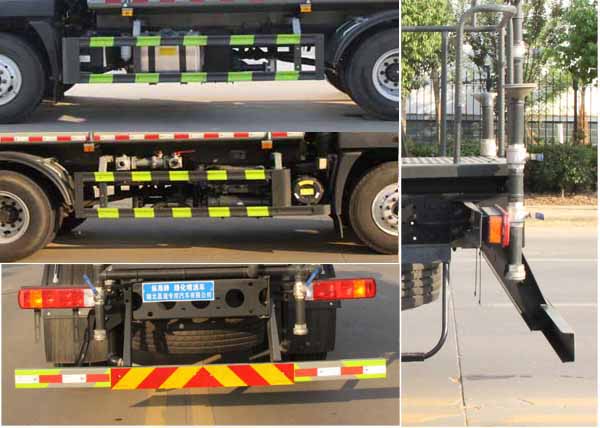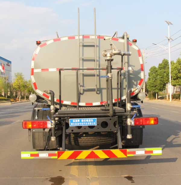 該車主要用于城鄉園林綠化噴灑作業.主要裝置為罐體及噴灑裝置.罐體總容量:10.06立方米,罐體有效容積:9.58立方米,罐體外形尺寸(×長軸×短軸)(mm):4200×2300×1450.ABS系統型號:ABS-E;生產企業:威伯科汽車控制系統(中國)有限公司.ABS系統型號:ABS-VI.E;生產企業:廣州瑞立科密汽車電子股份有限公司;ABS系統型號:3550D-1010;生產企業:東科克諾爾商用車制動系統(十堰)有限公司.側、后防護材料均為:Q235碳鋼,連接方式均為:螺栓連接,后部防護截面尺寸(mm):120×50,后部防護離地高度(mm):470.僅采用底盤3950mm軸距改裝.選裝前部電子霧炮裝置樣式;選裝前部不帶電子霧炮裝置,當前部選裝不帶電子霧炮時,車長7450mm,7785mm,無前伸.當前部選裝帶電子霧炮時,車長7950mm,8285mm,前伸為500mm.隨底盤選裝限速裝置,最高車速(km/h)90.后軸僅采用鋼板彈簧懸架.