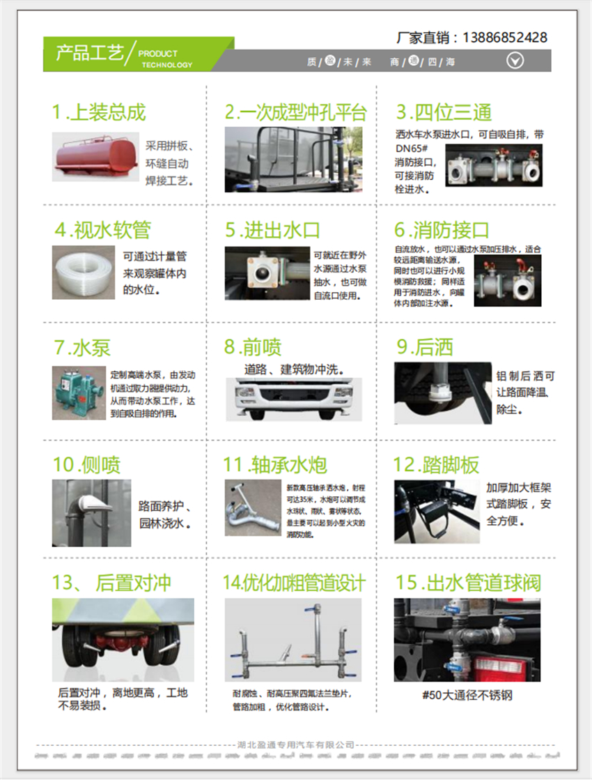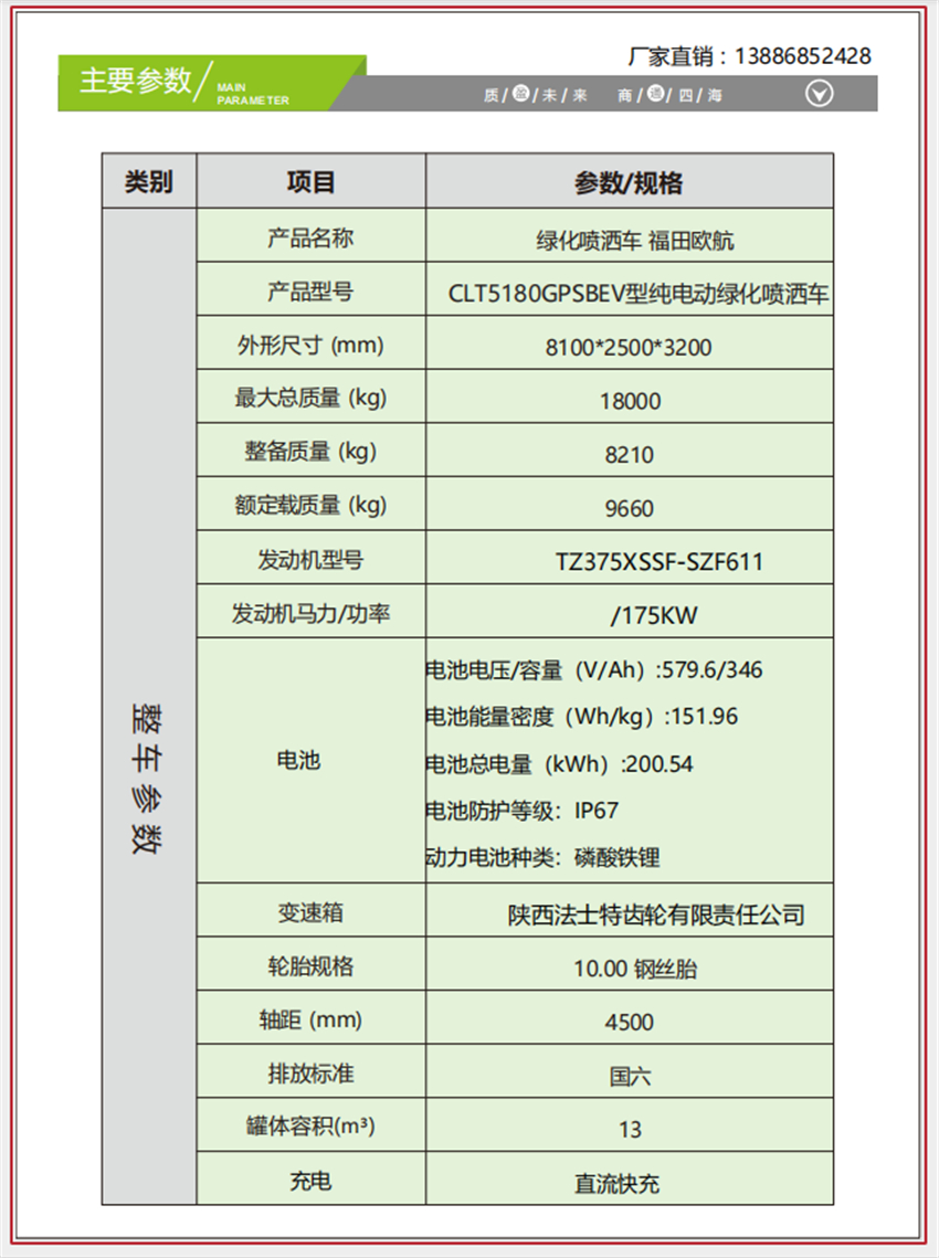 福田歐航灑水車(chē)_電動(dòng)霧炮車(chē)_純電動(dòng)灑水車(chē),京牌13噸灑水車(chē),湖北盈通專(zhuān)用汽車(chē)有限公司,該車(chē)主要用于城鄉(xiāng)園林綠化,路面噴灑;主要裝置為罐體及噴灑裝置.罐體總?cè)萘?10.6立方米;罐體有效容積10.1立方米;介質(zhì):丙酮水溶液,密度950千克/立方米,罐體外形尺寸(長(zhǎng)×長(zhǎng)軸×短軸)(mm):4600×2300×1450.側(cè)防護(hù)采用電池護(hù)罩代替,材料為Q235碳鋼,螺栓連接;后防護(hù)材料為:Q235碳鋼,連接方式為:螺栓連接,后部防護(hù)截面尺寸(mm):120×50,后部防護(hù)離地高度(mm):490;ABS型號(hào)/生產(chǎn)企業(yè):ABS-E/采埃孚商用車(chē)系統(tǒng)(青島)有限公司;電池種類(lèi):磷酸鐵鋰電池,儲(chǔ)能裝置單體生產(chǎn)企業(yè):寧德時(shí)代新能源科技股份有限公司,儲(chǔ)能裝置總成生產(chǎn)企業(yè):寧德時(shí)代新能源科技股份有限公司;電機(jī)型號(hào)/生產(chǎn)企業(yè):TZ375XSSF-SZF611/陜西法士特齒輪有限責(zé)任公司,額定功率:105kW,峰值功率:175kW.選裝前部電子水炮樣式,選裝前部不帶電子水炮,該狀態(tài)下車(chē)長(zhǎng)為8100mm;當(dāng)前部安裝電子水炮時(shí),車(chē)長(zhǎng)為8600mm,車(chē)輛前伸500mm.后部箭頭指示燈僅在車(chē)輛作業(yè)時(shí)開(kāi)啟.選裝車(chē)輛前部鴨嘴裝置.選裝噴灑裝置樣式.選裝管道口位置. |