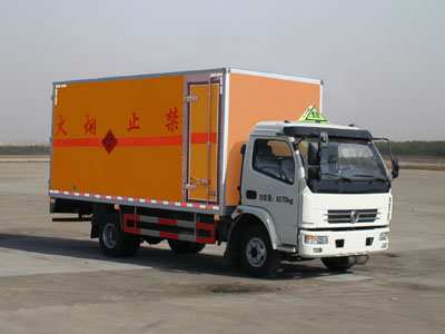 運輸品名:炸藥,雷管,煙花爆竹等,類項號:1.1B,1.1D,1.1G,1.2G,1.3G,1.4G 等。廂體頂部封閉不可開啟,側、后防護裝置材料材質為Q235A碳鋼,側防護與箱體底部焊接連接,后防護裝置與車架采用焊接連接,后防護截面尺寸(mm):100?0,離地高度為450mm。該車隨底盤選裝駕駛室,選裝側面開門。僅選用發動機型號: ISB3.9-125E40A、YC4E140-42對應的油耗值分別為(L/100km): 18.83、19.39。安裝前輪盤式制動器,安裝子午線輪胎和帶ABS的底盤。安裝帶有衛星定位功能的行駛記錄儀。ABS系統生產廠家/型號:東風電子科技股份有限公司汽車制動系統公司/36BG13-30010。